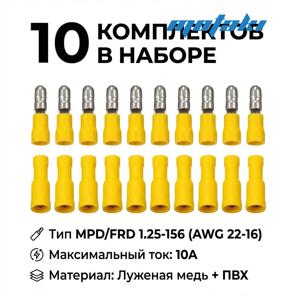 Набор круглых клемм «Пуля» (Папа-Мама) изолированных, 10 комплектов. Желтые, под обжим (AWG 22-16).