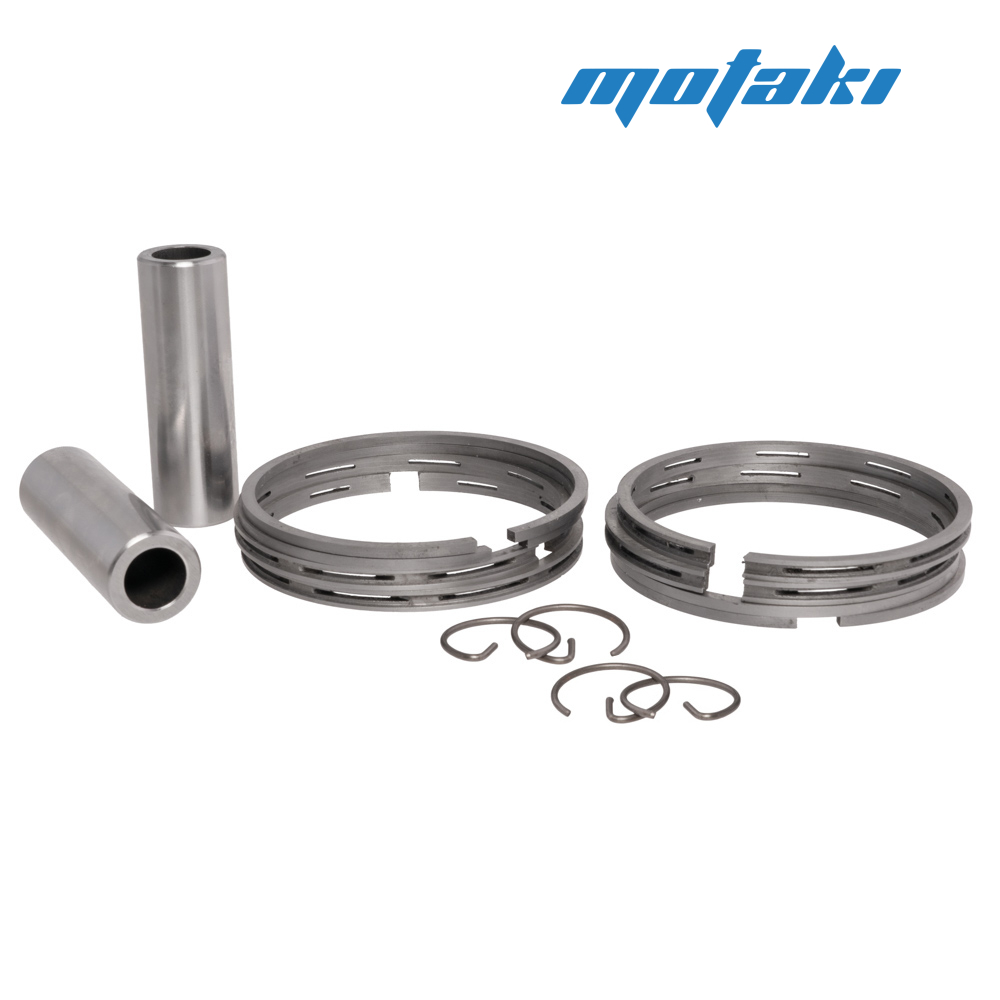 В наборе: 2 цилиндра (Китай), 2 поршня номинального размера (Россия), поршневые кольца на 2 поршня (Россия), поршневые пальцы - 2 шт. (Китай), стопорные кольца - 4 шт.