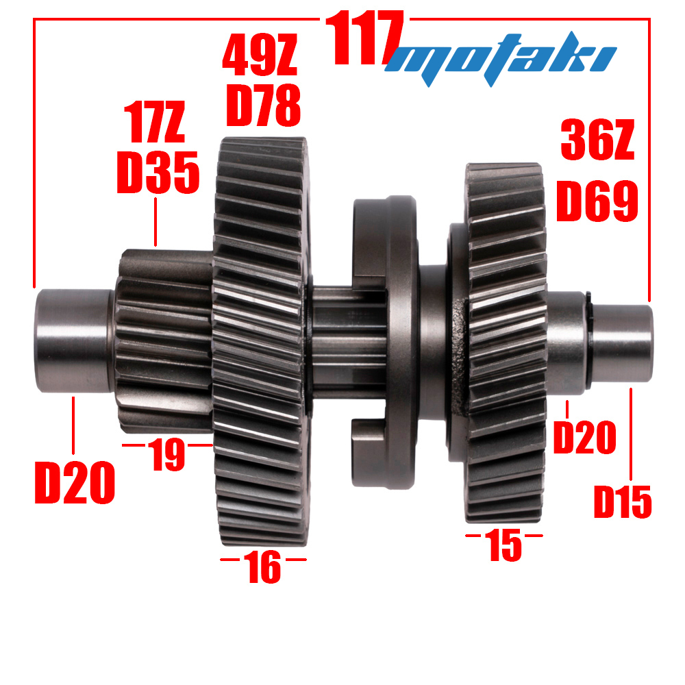 Вал скомплектован следующими шестернями: 17, 36, 49 зубов. Длина вала 117 мм.